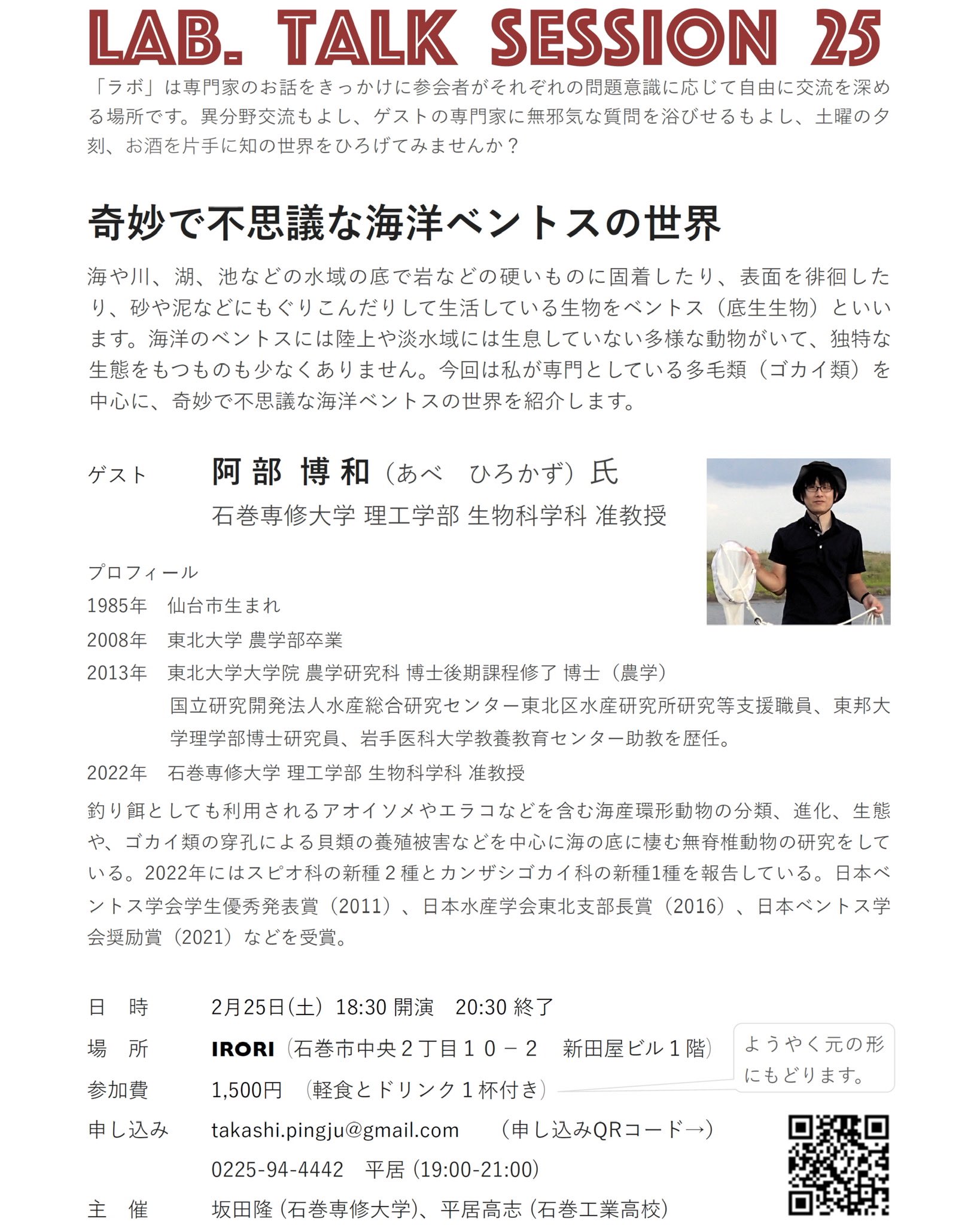 2月25日(土)IRORI石巻にて、阿部博和准教授(#海洋ベントス学研究室)によるトークセッションが行われます。